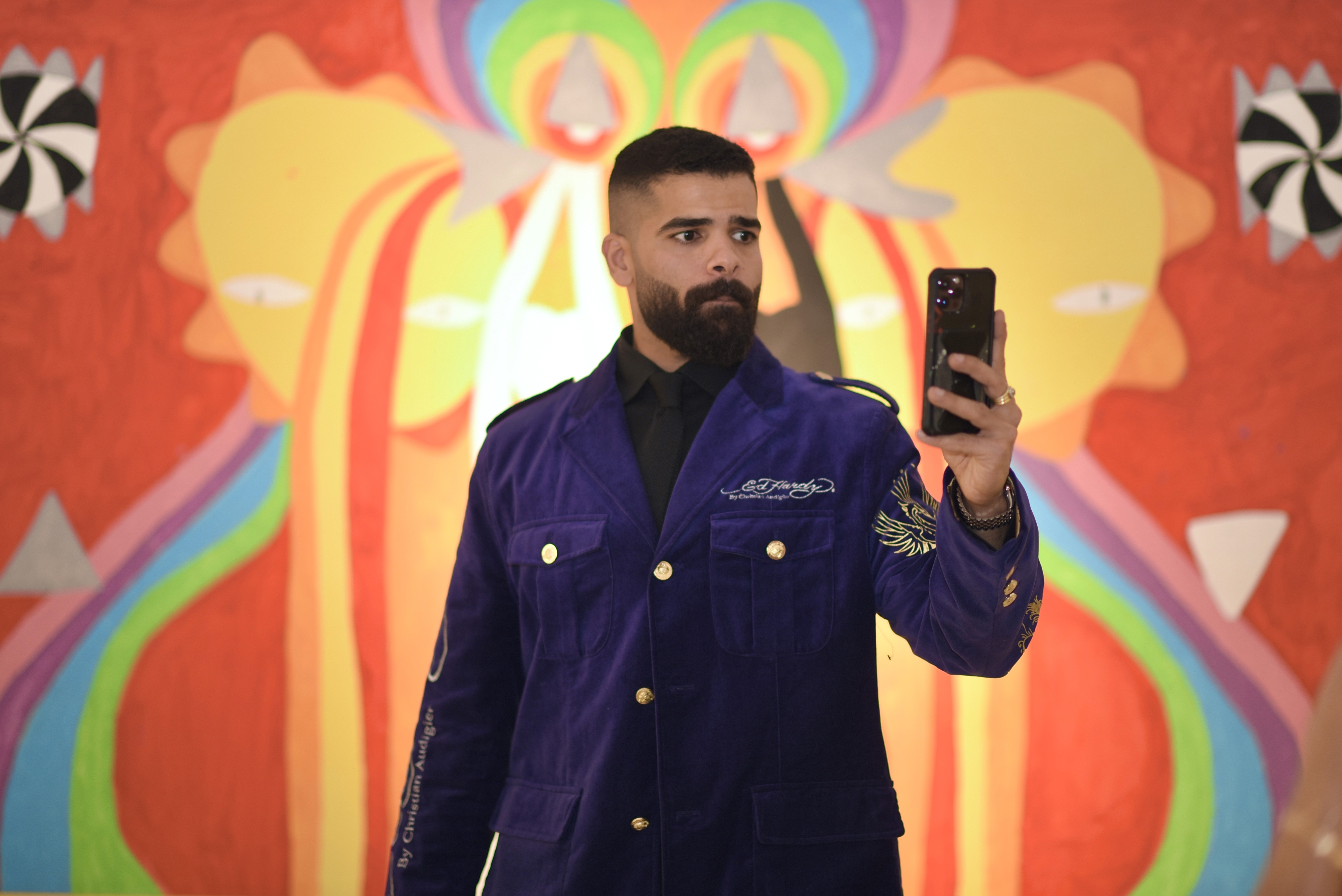 Al Najem aims to incorporate elements of “the spirit” into his works, throughout his process of making work. Using “heavy-duty” industrial materials and wall-paint, he explores unconscious thoughts and feelings that are not always bound to words. He aims to disentangle complex spiritual, mystical and societal matters and to simplify them through his presentation, by creating complex paintings and using common symbols from popular culture and / or contemporary life. According to Carl Jung, the collective unconscious is a collection of knowledge and imagery that every person is born with and is shared by all humans due to ancestral experience. Likewise, Al Najem avoids tampering with the production of his paintings and rather allows them to develop their own identity. He employs the ‘space’ as a vessel for the collective-unconscious to flow through him.